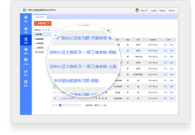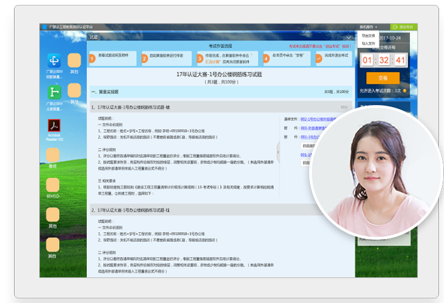 单选题、多选题、判断题、区间填空题,可以使用任何公司的产品进行考试。 实操题:测评认证独创的建筑类软件操作考核系统,可实现在线出题、在线考核、机器自动判题,完美解决建筑类软件的实际操作技能评定,支持广联达BIM钢筋算量、土建算量、安装计量、BIM5D等软件。