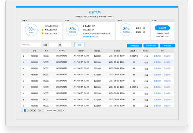 告别纸笔时代,向厚重的纸质试卷byebye。全国考生同时进行,再也不用东奔西跑。数万考生在线监控,监拍画面随时查看。详尽的数据报告,老板问啥都不怵。测试数据随时查阅,给考试提供理论支撑。