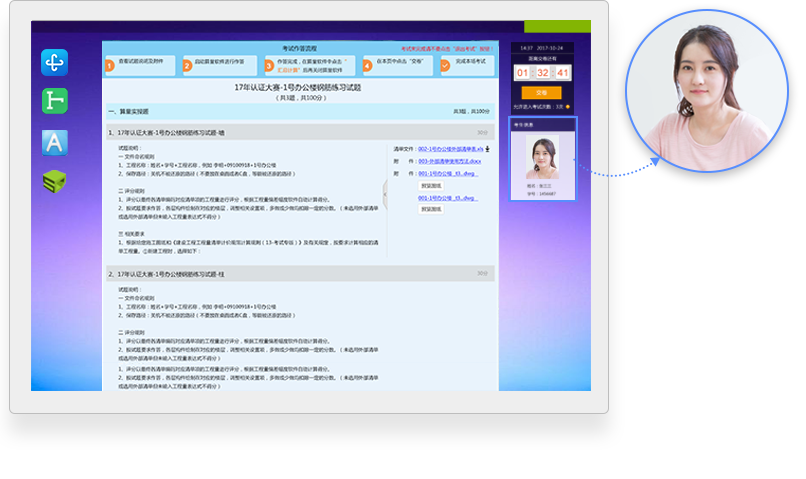 支持实操题、区间填空题、选择题、判断题等多个题型的考试及评分。
